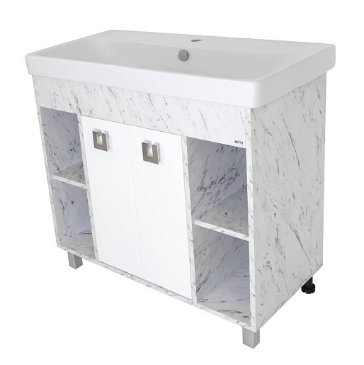 - Тумба под раковину Мия 90: распашные фасады, открытые полки, доводчики, фурнитура-хром.