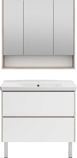 В комплекте: тумба, раковина, зеркальный шкаф, подвес (2 шт.), ножки (2 шт.).