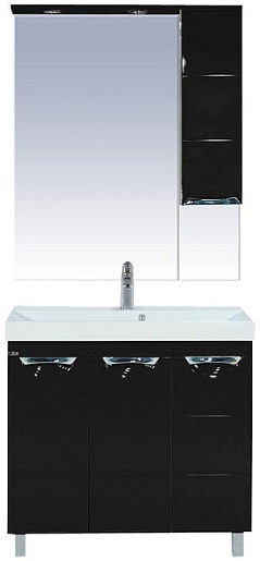 Комплектация: зеркальное полотно, козырек со встроенной подсветкой, распашной шкаф с вкладными полками.