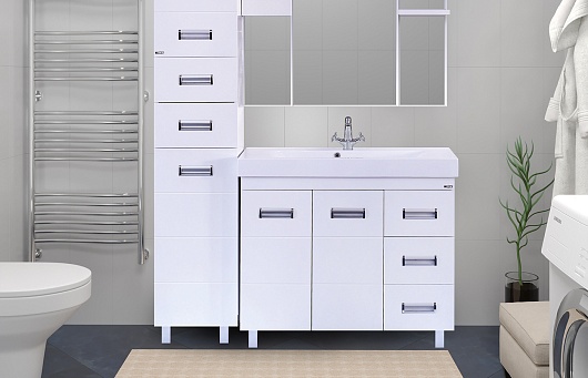 - тумба под раковину: 2 распашные дверцы, 3 выдвижных ящика, 5 врезных металлических ручки, вкладная полка, крепления и опорные ножки