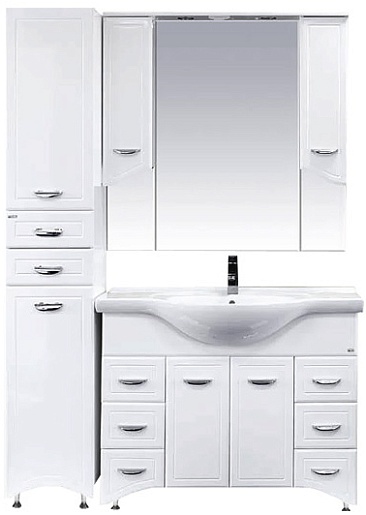 Описание: Пенал для ванной с двумя дверцами, выдвижными ящиками и бельевой корзиной. Монтаж подвесной и напольный, в комплекте крепления и опорные ножки.
