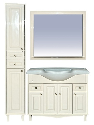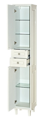 Комплектация пенала - 2 дверцы, стеклянные полки, 2 ящика, ножки, петли и направляющие в ящиках с доводчиками.