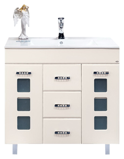 - тумба под раковину: 2 распашные дверцы с вставками матового стекла, 3 выдвижных ящика, 5 металлических ручек, комплект опорных ножек и крепления