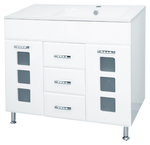 - тумба под раковину: 2 распашные дверцы с вставками матового стекла, 3 выдвижных ящика, 5 металлических ручек, комплект опорных ножек и крепления