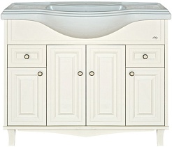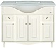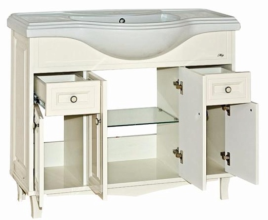 - тумба под раковину: МДФ, имеет две распашные двери по центру, внутри (нерегулируемая по высоте стеклянная полка) посередине, два ящика по краям и две дверцы под ними.