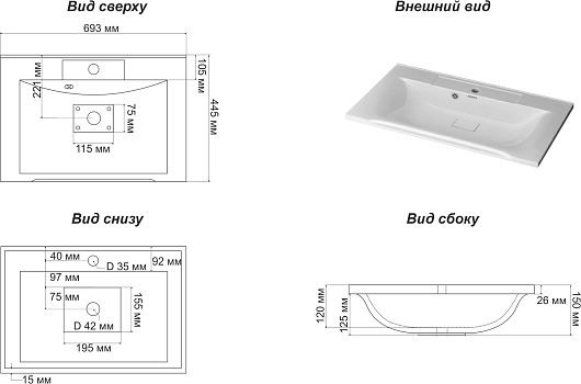 В комплекте: тумба, раковина, ножка (4 шт.), подвесы (2 шт.).