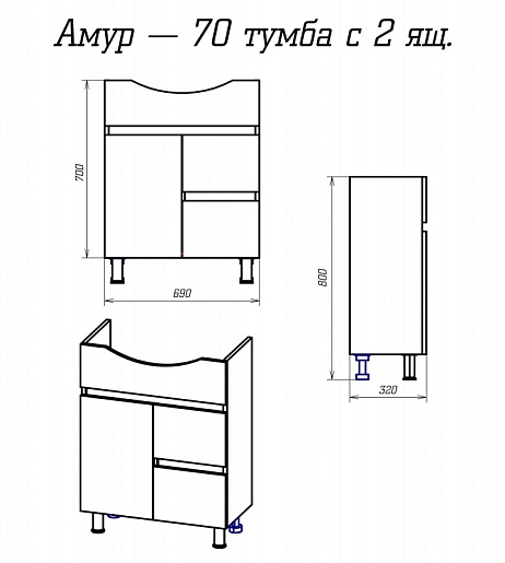 Амур 70 тумба напольная, распашной фасад, 2 ящика, регулируемые опоры