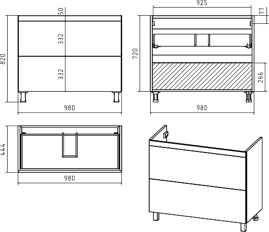 В комплекте: тумба, раковина, ножка (4 шт.), комплект креплений.