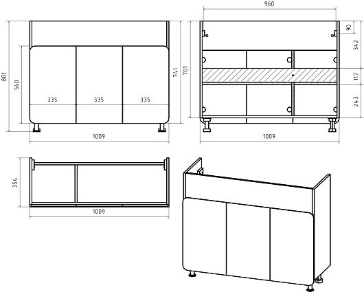 В комплекте: тумба, раковина, ножка (4 шт.), комплект креплений.