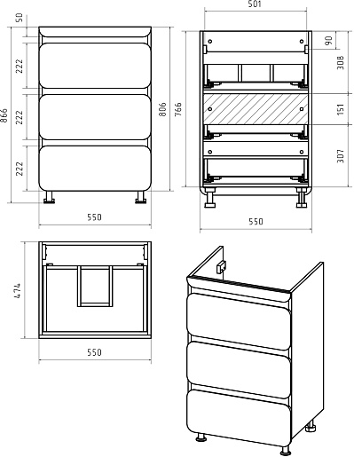 В комплекте: тумба, раковина, ножка (4 шт.), комплект креплений.