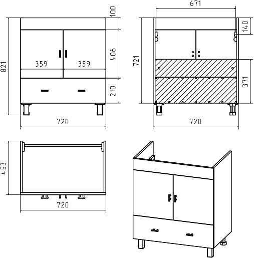 - 2 дверцы, 1 ящик.