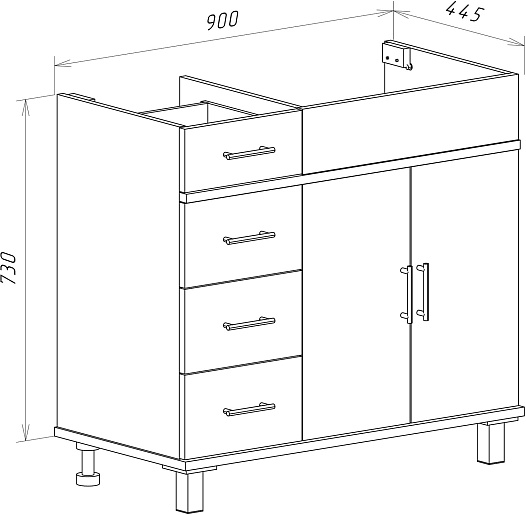 - Габариты корпуса тумбы (ШxГxВ): 900х438х727 мм.
