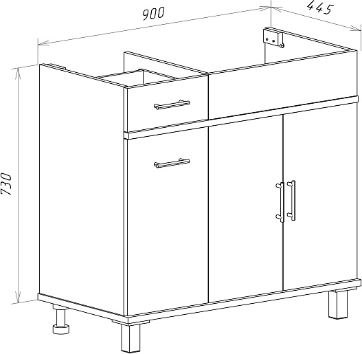 - Габариты корпуса тумбы (ШxГxВ): 900х438х727 мм.