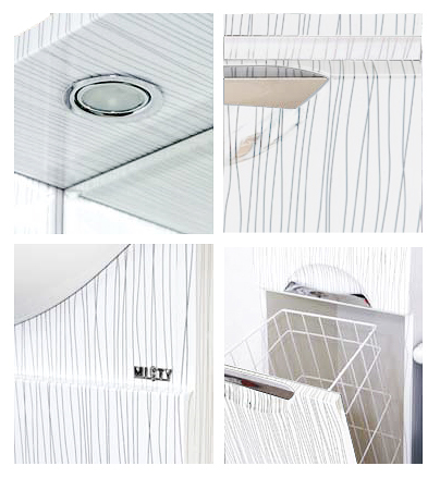 Комплектация: зеркальное полотно с двумя полками, козырек со встроенными светильниками. Слева распашной ящик.
