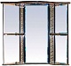 Комплектация: Угловой зеркальный шкаф с полками и распашной дверцей, козырек со светильниками. Резной декор.