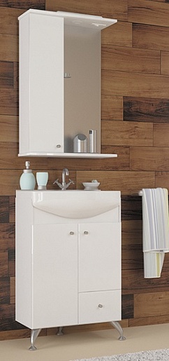 Комплектация: влагостойкое зеркальное полотно, шкафчик, полочки, подсветка.
