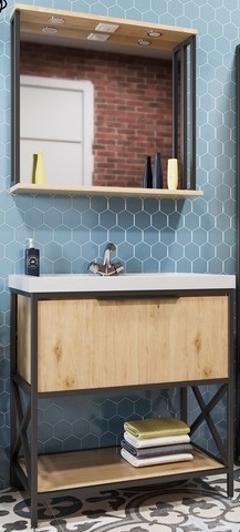 - Зеркало Бруклин 80 арт. 543584: влагостойкое полотно, полочка, розетка, светильники.