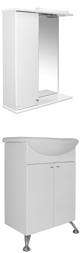 Комплектация: влагостойкое зеркальное полотно, шкафчик, полочки, подсветка.