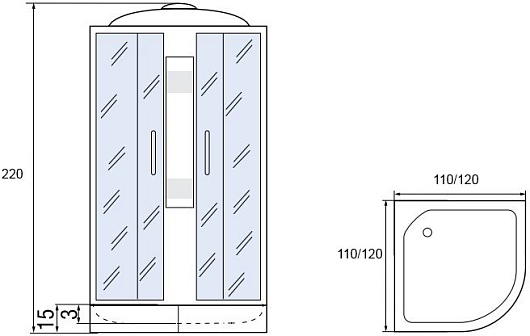 Комплектация: душевая кабина, поддон, сифон.
