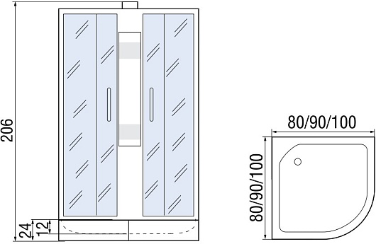 Душевая кабина 90x90 Б/К 90/24 С МЗ – ещё одна модель от известного российского изготовителя «Мономах». Реализована кабина в форме четверти круга – универсальном варианте, позволяющим не задумываться о её расположении в комнате, ведь она легко впишется в угол, не занимая лишнего пространства. Его габариты 206 на 90 на 90 сантиметров не только обеспечивают максимум свободы движений, но также делают возможным размещение кабины в помещении с невысоким потолком.