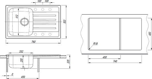 Большая прямоугольная чаша выполнена из нержавеющей стали, а бортики и широкое крыло - из литьевого мрамора.