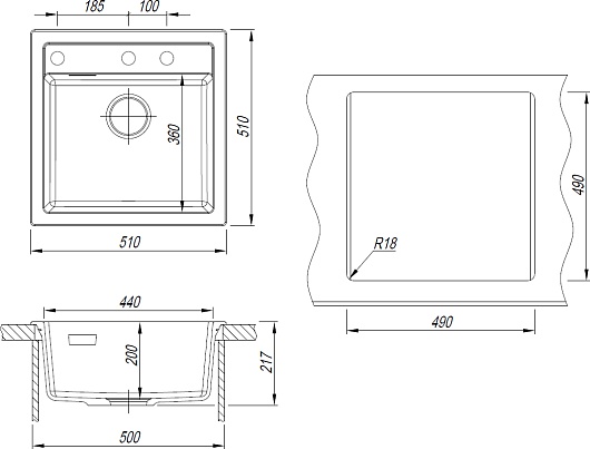 - 3 размеченных отверстия для установки смесителя.