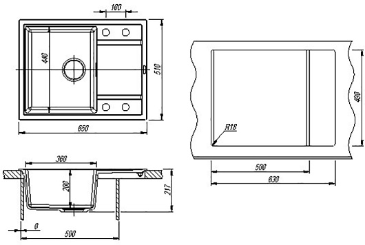 - 4 размеченных отверстия для установки смесителя.