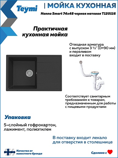 Teymi Мойка кухонная Hanna Smart 74 кварцевая черная матовая