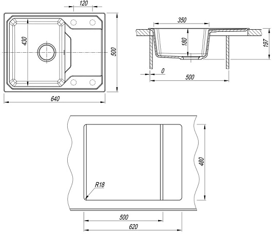 • 4 размеченных отверстия под смеситель.