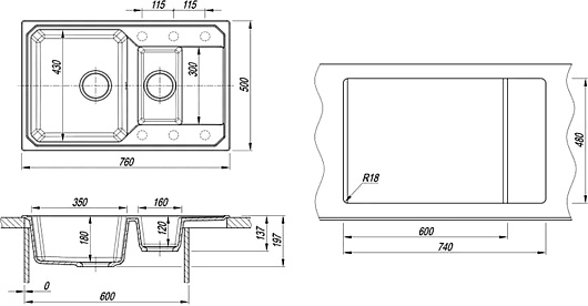 - 6 размеченных отверстий под смеситель.