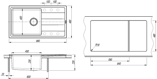 - 6 размеченных отверстия под смеситель.