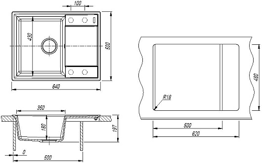 - 4 размеченных отверстия для установки смесителя.
