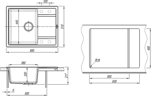- 4 размеченных отверстия для установки смесителя.