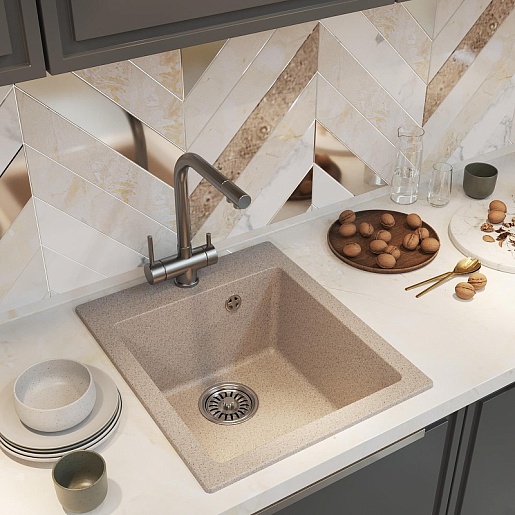 - Мойка из искусственного мрамора: прочная, бесшумная и гигиеничная, легко ремонтируется, устойчива к высоким температурам, проста в уходе, производится в разных оттенках.