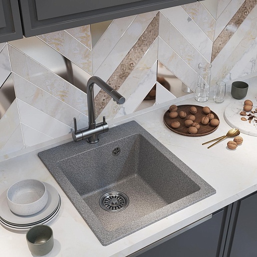 - Мойка из искусственного мрамора: прочная, бесшумная и гигиеничная, легко ремонтируется, устойчива к высоким температурам, проста в уходе, производится в разных оттенках.