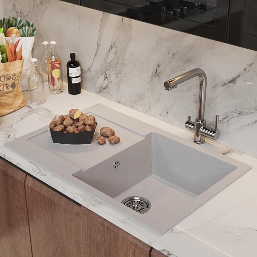 - Мойка из искусственного мрамора: прочная, бесшумная и гигиеничная, легко ремонтируется, устойчива к высоким температурам, проста в уходе, производится в разных оттенках.
