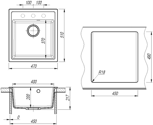 - 3 размеченных отверстия для установки смесителя.