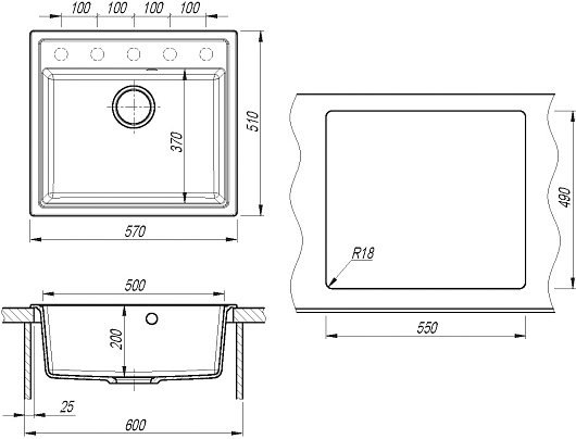 - 5 размеченных отверстий для установки смесителя.