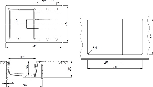 - 6 размеченных отверстий для установки смесителя.