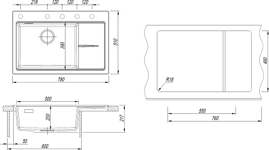 - Размер чаши (ШxГxВ): 500 х 390 х 200 мм.