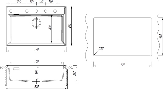 - 5 размеченных отверстий для установки смесителя.