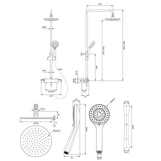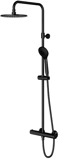 - смеситель термостатический для душа; - ограничитель горячей воды на 38°C; - верхний душ латунный (WG125BL), размер: ø25 см, отдаленность от стены: 43 см; - душевая лейка (YOSEMITE-RBL) с 5-ю функциями; - режимы струи: массаж, туман, аэрированный дождь, аэрированный массаж, аэрированный туман; - душевой шланг в оболочке ПВХ (028BL), длина: 150 см; - переключатель струи верхний душ/ручной душ, встроенный в смеситель; - регулируемая высота, минимальная/максимальная высота системы: 93 см/156 см.