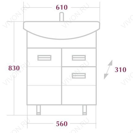 - тумба под раковину: распашные дверцы, выдвижной ящик, полка внутренняя, ручки врезные - металл (хром), ножки передние - пластик (хром), ножки задние (регулируемые) - пластик
