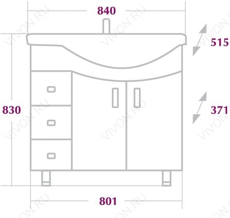 - тумба под раковину: 3 выдвижных ящика, распашные дверцы, полка внутренняя, ручки - металл (хром), ножки передние (регулируемые) - металл (хром), ножки задние (регулируемые) - пластик