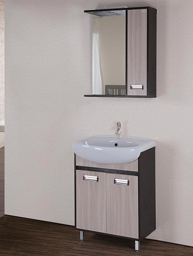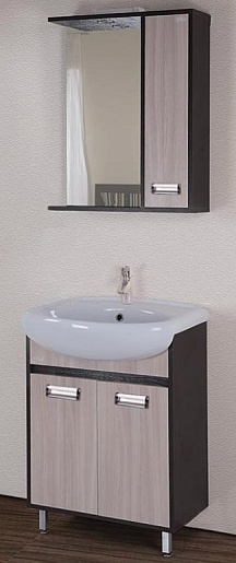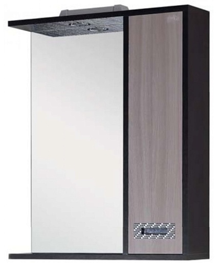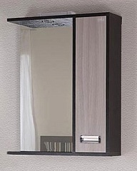 Комплектация: влагостойкое зеркальное полотно с боковым шкафчиком с распашной дверцей с механизмом доводчика. Внутренние отделение с полочками. Хромированная фурнитура, фасад и корпус из влагостойкого ЛДСП покрытого шпоном.