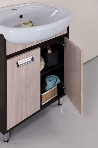 - тумба под раковину: 2 распашных дверцы, вкладная полка, 2 ручки (хром), 4 ножки, комплект полкодержателей, комплект доводчиков