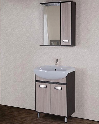 Комплектация: влагостойкое зеркальное полотно с боковым шкафчиком с распашной дверцей с механизмом доводчика. Внутренние отделение с полочками. Хромированная фурнитура, фасад и корпус из влагостойкого ЛДСП покрытого шпоном.