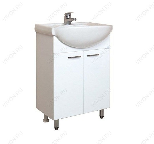 Описание: напольная тумба с двумя распашными дверцами, фасады из MDF, корпус — ЛДСП. Фаянсовая раковина Эрика 55 (Cersanit), хромированная фурнитура.
