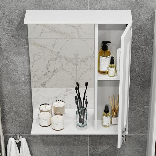- Влагостойкое зеркальное полотно с полочкой, справа - шкафчик с распашной дверцей из МДФ, декорированный вставкой из матового, закаленного стекла.