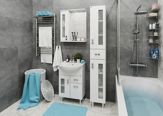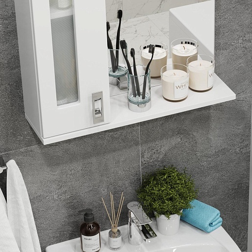 - Влагостойкое зеркальное полотно с полочкой, справа - шкафчик с распашной дверцей из МДФ, декорированный вставкой из матового, закаленного стекла.